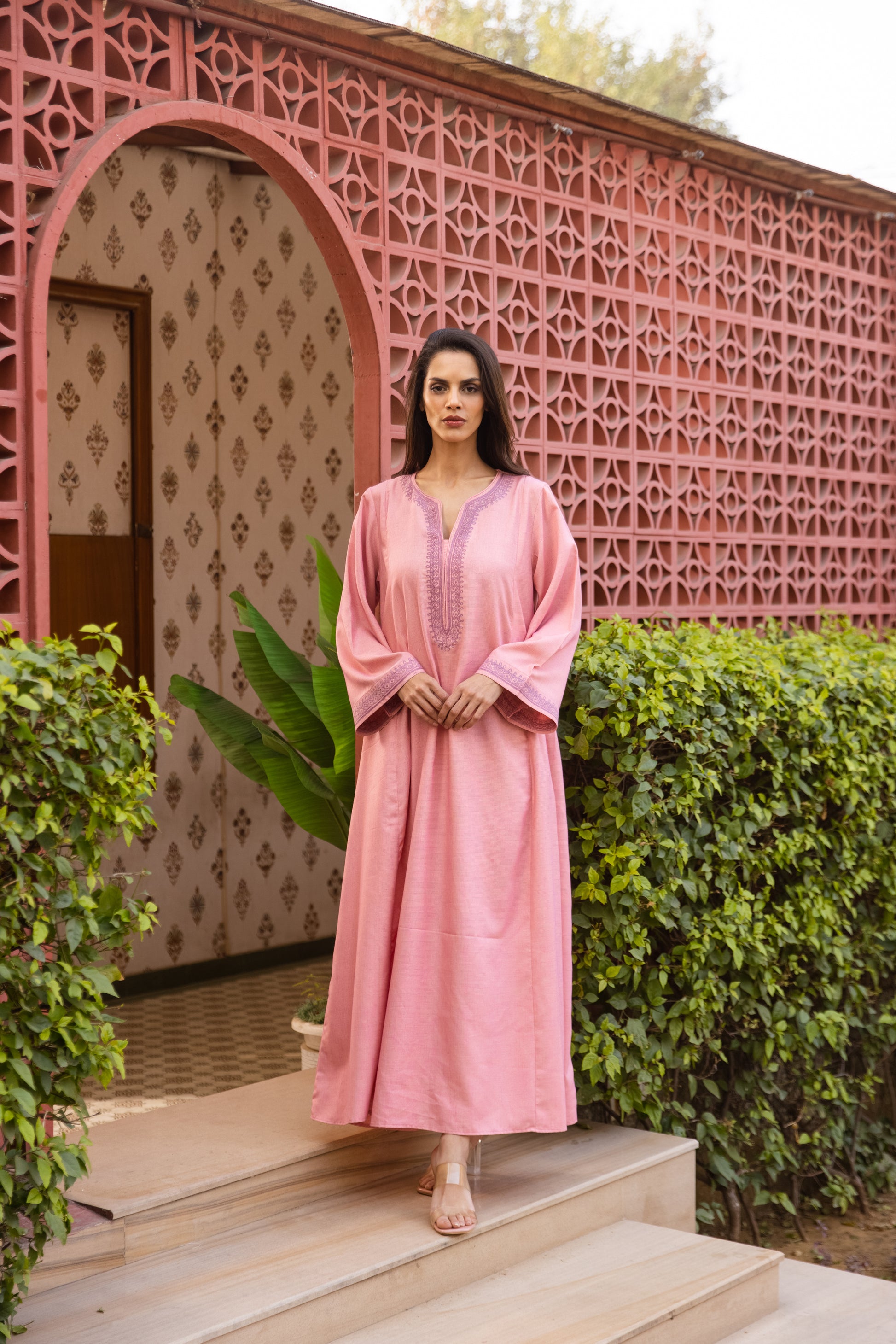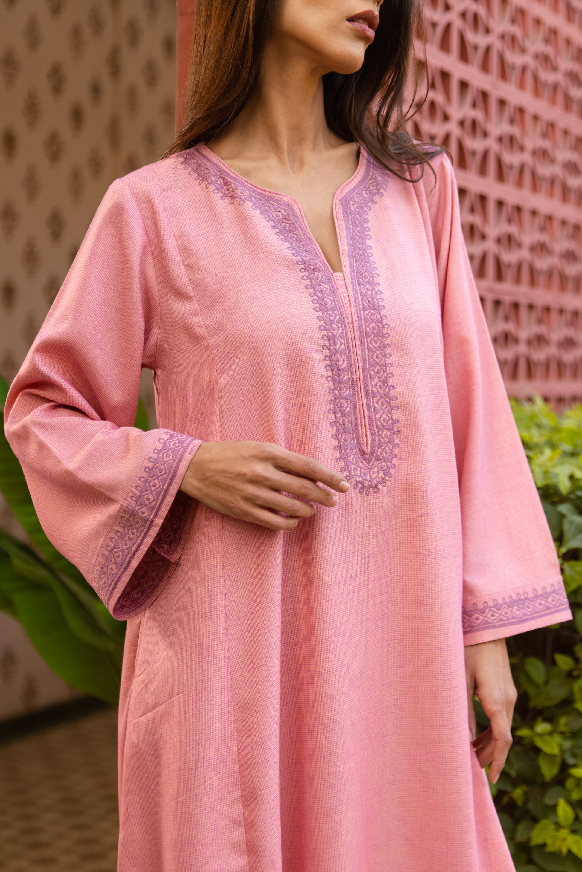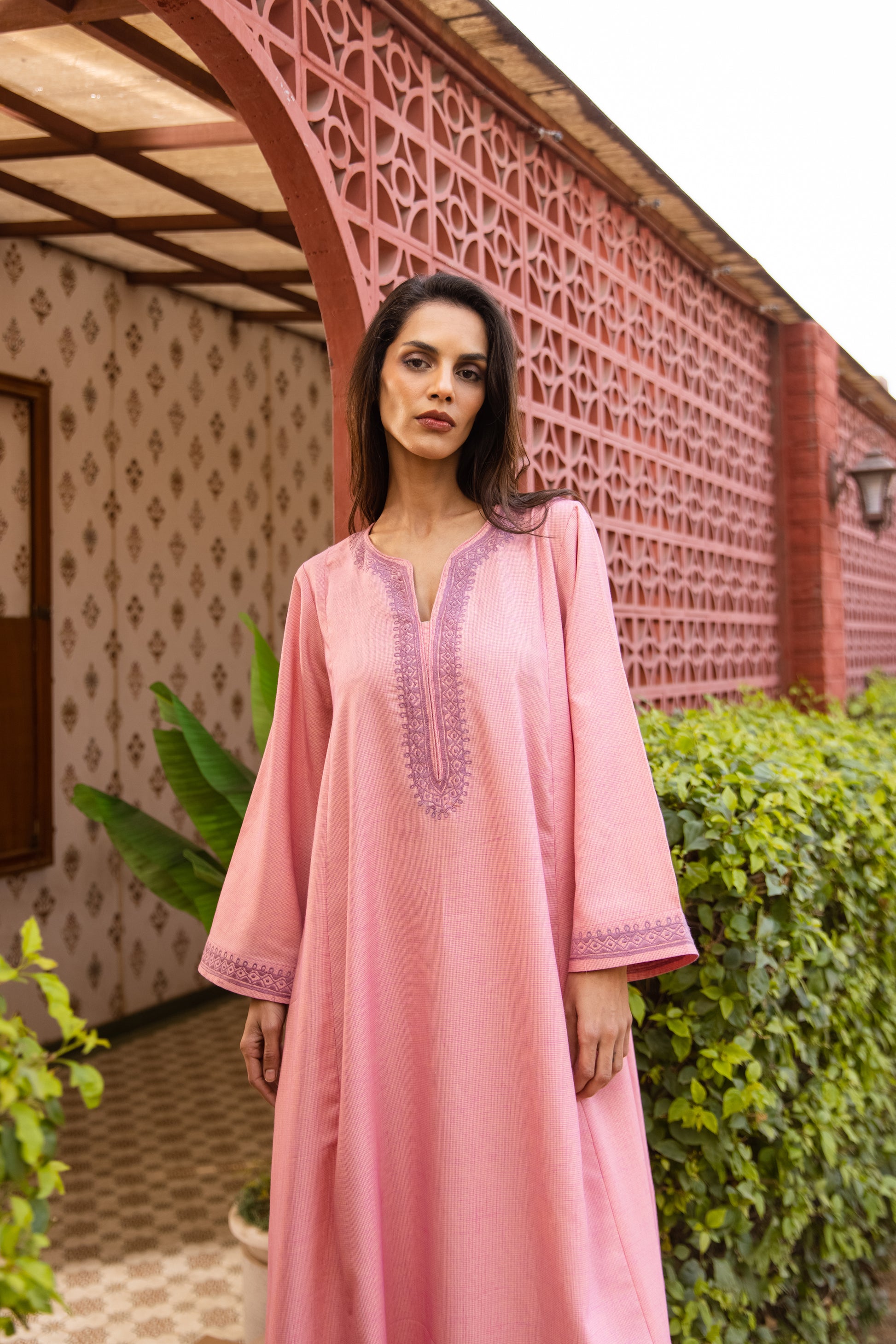 This Embroidered Jalabiya in handwoven cotton and viscose is wardrobe staple. The simple yet luxurious finish of the handwoven fabric also makes it a statement piece